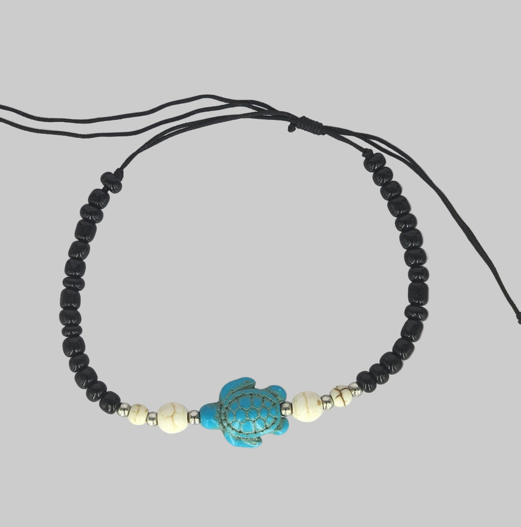 Home Shop Bracelets & Bangles Bracelet black beads and blue turtle, white bead.