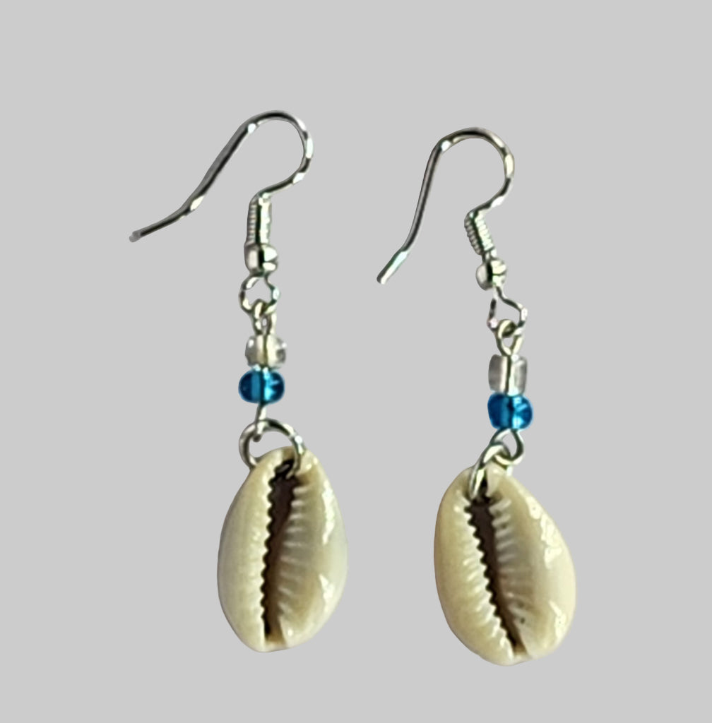 Earring with Sliced Cowrie and Clear and Blue Beads