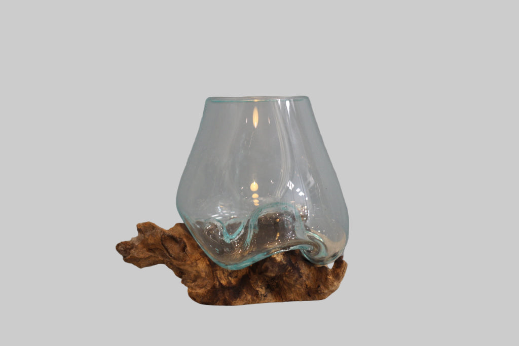 Wooden root decoration. Each root is one of a kind. Sand blasted and treated. Glass is shaped according to the shape of the root. Use as fishbowl or vase for plants. Our collection of table items combines the beauty of natural shells with the durability of wood to create unique and functional pieces. Handcrafted with care, each piece showcases the intricate patterns and colors of the shells, collected from the beaches of Bali and the Philippines, and the warm tones of the wood, sourced sustainably from local forests. From coasters to napkin holders, spoons, toothpick holders, bowls, and forks, these pieces not only protect your furniture but also add a touch of coastal charm to any room. Whether you're looking to create a beach-themed decor or simply want to bring a touch of nature into your home, these table items are the perfect addition. Made with love and care, these one-of-a-kind pieces are brought to you from the exotic shores of Bali and the Philippines, ready for you to enjoy for years to come.