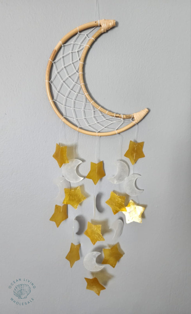 Capiz shells, known for their iridescent quality, are a popular material used in our hangers and wind chimes. The shells come in a range of colors, from delicate pinks and blues to deep greens and yellows. The shells are arranged in intricate patterns to create stunning designs that showcase the natural beauty of the materials.